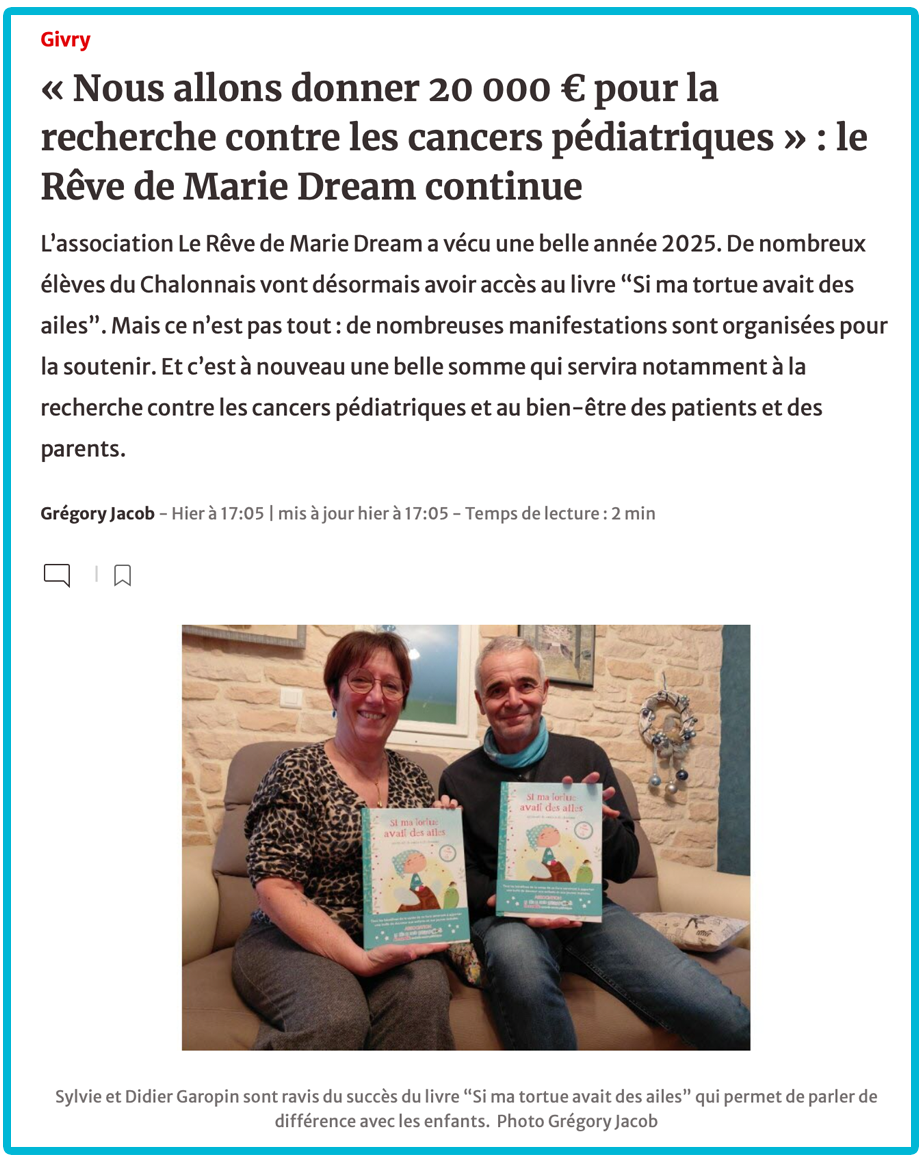 Le livre "Si ma Tortue avait des ailes" que j'ai illustré pour l'association Le Rêve de Marie Dream avec les magnifiques mots d'Anne Prost Cossio et les sublimes musiques de Vezio Cossio continue son envol ! Il sera bientôt distribué dans toutes les écoles primaires du Grand Chalon !